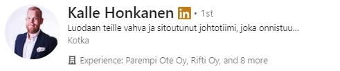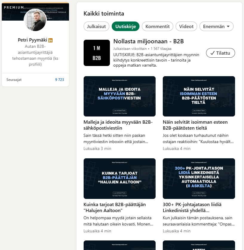 Olen itse tehnyt suurimman osan kaupoistani Linkedin-viesteillä ja markkinointiautomaatioilla - kaikki etänä jo vuodesta 2020. Näytän mielelläni mitkä keinot sinun alallasi toimii päättäjien tavoittelussa nykyaikana.